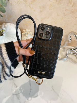 Alligator Print Celine iPhone Case With Card Holder And Strap Blcak -EYP241415